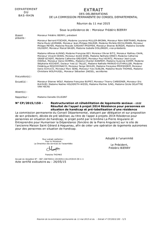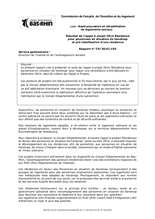 Le présent rapport vise à présenter la suite de l'appel à projet 2014 'Résidence pour personnes en situation de handicap' pour lequel une candidature a été déposée en décembre 2014, date de clôture de l'Appel à Projets. Les porteurs de projets ont été auditionnés le 25 mars dernier par le jury ad hoc, créé par le Conseil départemental afin d'examiner la faisabilité de l'opération en vue de sa pré labélisation éventuelle. Un nouveau jury se déroulant au courant du premier semestre 2016 examinera la labélisation définitive de l'opération permetant ainsi l'attribution par le Conseil Départemental d'une subvention.