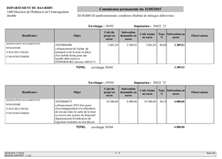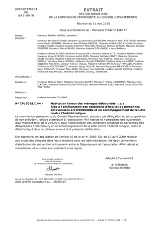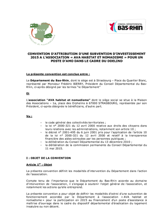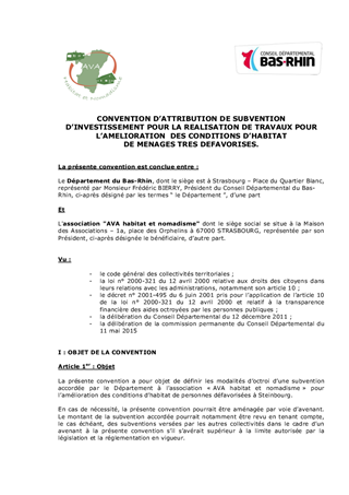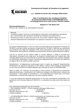 Le présent rapport concerne 2 demandes de l'association AVA habitat et nomadisme pour l'amélioration des conditions d'habitat de ménages très défavorisés à Steinbourg et dans le cadre des actions de lutte contre l'habitat indigne au titre du dispositif départemental d'éradication du logement insalubre ou non décent.