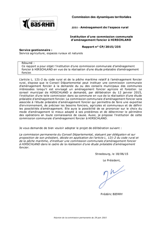Ce rapport a pour objet l’institution d’une commission communale d’aménagement foncier à HIRSCHLAND en vue de la réalisation d’une étude préalable d’aménagement foncier.