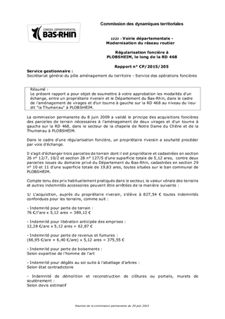 Le présent rapport a pour objet de soumettre à votre approbation les modalités d'un échange, entre un propriétaire riverain et le Département du Bas-Rhin, dans le cadre de l'aménagement de virages et d'un tourne à gauche sur la RD 468 au niveau du lieu-dit "la Thumenau" à PLOBSHEIM.