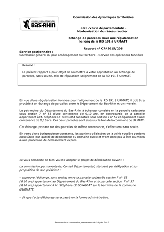 Le présent rapport a pour objet de soumettre à votre approbation un échange de parcelles, sans soulte, afin de régulariser l'alignement de la RD 191 à URMATT.