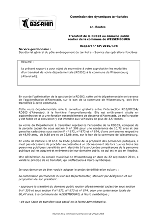 Le présent rapport a pour objet de soumettre à votre approbation les modalités d’un transfert de voirie départementale (RD303) à la commune de Wissembourg (Altenstadt).