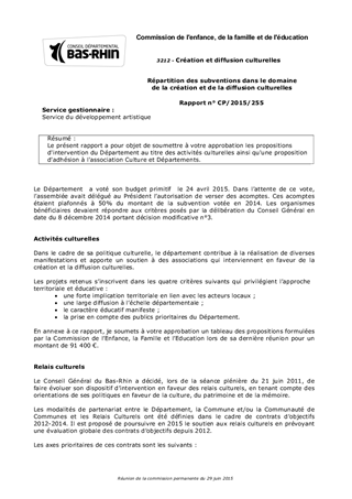 Le présent rapport a pour objet de soumettre à votre approbation les propositions d'intervention du Département au titre des activités culturelles ainsi qu'une proposition d'adhésion à l'association Culture et Départements.