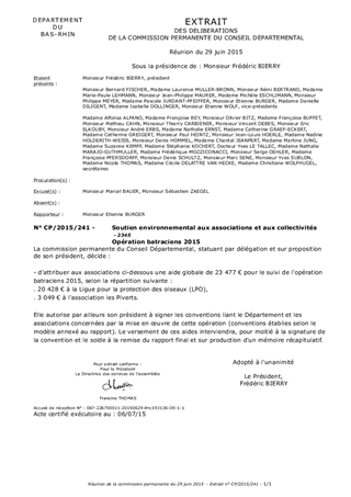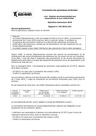 Le Conseil Départemental a voté son budget primitif le 24 avril 2015. La commission permanente du 2 mars 2015 a permis, dans un premier temps, la validation et la signature des conventions relatives à la sécurité des opérations annuelles de préservation des batraciens, menées par les associations, lors des migrations sur les routes départementales. Le présent rapport a pour objet l’attribution des subventions liées à cette campagne.