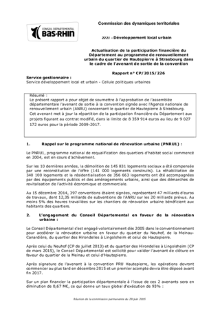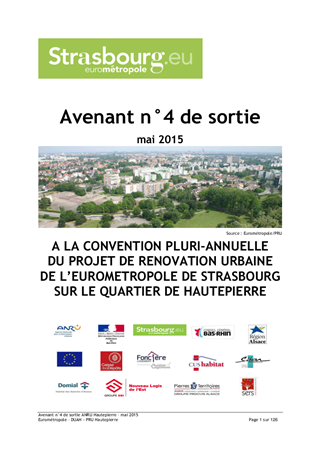 Le présent rapport a pour objet de soumettre à l'approbation de l'assemblée départementale l'avenant de sortie à la convention signée avec l'Agence nationale de renouvellement urbain (ANRU) concernant le quartier de Hautepierre à Strasbourg. Cet avenant met à jour la répartition de la participation financière du Département aux projets figurant au contrat modifié, dans la limite de 8 359 914 euros au lieu de 9 027 172 euros pour la période 2009-2017.