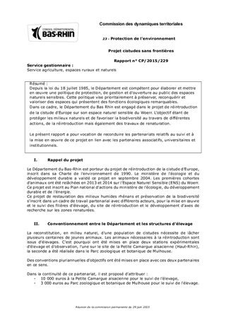 Depuis la loi du 18 juillet 1985, le Département est compétent pour élaborer et mettre en œuvre une politique de protection, de gestion et d'ouverture au public des espaces naturels sensibles. Cette politique vise prioritairement à préserver, reconquérir et valoriser des espaces qui présentent des fonctions écologiques remarquables. Dans ce cadre, le Département du Bas Rhin est engagé dans le projet de réintroduction de la cistude d’Europe sur son espace naturel sensible du Woerr. L’objectif étant de protéger les milieux naturels et de favoriser la biodiversité au travers de différentes actions, de la réintroduction mais également des travaux de renaturation. Le présent rapport a pour vocation de reconduire les partenariats relatifs au suivi et à la mise en œuvre de ce projet en lien avec les partenaires associatifs, universitaires et institutionnels.