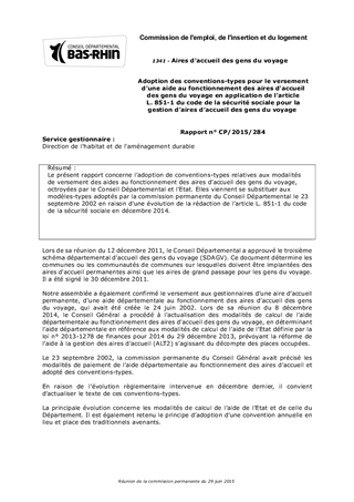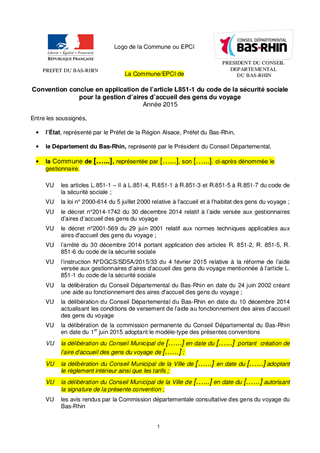 Le présent rapport concerne l'adoption de conventions-types relatives aux modalités de versement des aides au fonctionnement des aires d'accueil des gens du voyage, octroyées par le Conseil Départemental et l'Etat. Elles viennent se substituer aux modèles-types adoptés par la commission permanente du Conseil Départemental le 23 septembre 2002 en raison d’une évolution de la rédaction de l'article L. 851-1 du code de la sécurité sociale en décembre 2014.