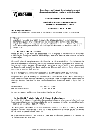 Le présent rapport a pour objet de soumettre à l'approbation de la commission permanente quatre propositions d’avances remboursables sans intérêts pour des projets d'immobilier d'entreprises, ainsi qu’un abandon de créance de 200 K€, dans le cadre de l'avance précédemment consentie pour le financement de l'extension de la société ISRI.