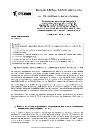 Le présent rapport a pour objet de soumettre à votre approbation et pour l'activité du Vaisseau : - une convention de partenariat avec l'association "société d'apiculture de Strasbourg-1869", - un avenant au contrat de partenariat avec l'Institut de Recherches contre les Cancers de l'Appareil Digestif (IRCAD), - un avenant au contrat de coproduction avec le PAIR et la société Amopix, - l'attribution d'une subvention au Jardin des Sciences de Strasbourg pour la coordination de la Fête de la Science 2015.