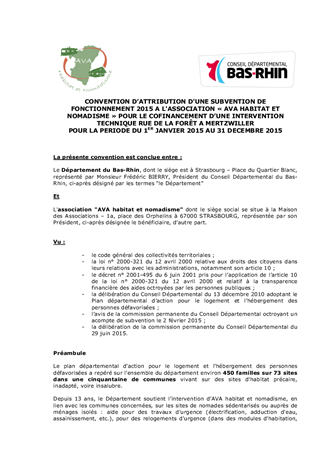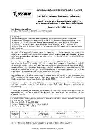 Le présent rapport concerne deux demandes pour l'amélioration des conditions d'habitat de ménages très défavorisés habitant sur des sites d'habitat dégradé, l'une déposée par l'association AVA habitat et nomadisme pour une action d'assistance à maîtrise d'ouvrage à Mertzwiller et la deuxième déposée par la commune de Kaltenhouse pour le site de résorption de l'habitat insalubre avant l'accès au logement des ménages.