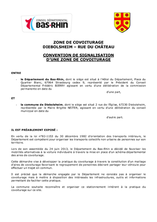 Lors de son assemblée plénière du 24 juin 2013, le Département a décidé de favoriser les mobilités alternatives à la voiture individuelle à travers l'adoption d'un schéma départemental des aires de covoiturage. Le schéma fixe notamment l'objectif d'utiliser au maximum les infrastructures existantes par la réservation de places de covoiturage sur des parkings publics ou privés. C'est ainsi que plusieurs sites ont été démarchés afin de mettre à disposition gratuitement une dizaine de places réservées au covoiturage. Chaque accord fait l'objet d'une convention de signalisation entre le Département et le propriétaire afin de fixer les conditions d'utilisation de la zone de covoiturage. Le présent rapport a pour objet d'approuver les conventions de signalation des zones de covoiturage au sein des communes de Gerstheim et Diebolsheim
