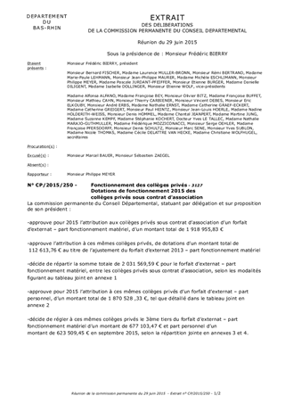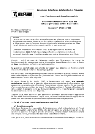 L’article L442-9 du code de l’éducation prévoit que les dépenses de fonctionnement des classes sous contrat d’association des collèges privés soient prises en charge par le Département sous la forme de deux contributions forfaitaires annuelles par élève (forfait d’externat part fonctionnement matériel et part personnel) Le rapport présente les modalités de calcul et de répartition des dotations de fonctionnement 2015 (forfait d'externat part fonctionnement matériel et part personnel) destinées aux 13 collèges privés sous contrat d’association avec l’Etat.