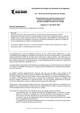Lors de sa réunion du 2 mars dernier, la commission permanente du Conseil Départemental avait donné un avis favorable à l'octroi d'un acompte avant le vote du budget, pour l'octroi d'une subvention à l'association "AVA habitat et nomadisme" qui porte une action de médiation concernant les grands passages de gens du voyage et qui est cofinancée par l'Etat et le Département. Le présent rapport concerne le renouvellement de l'octroi d'une subvention à cette association pour le cofinancement de l'action.