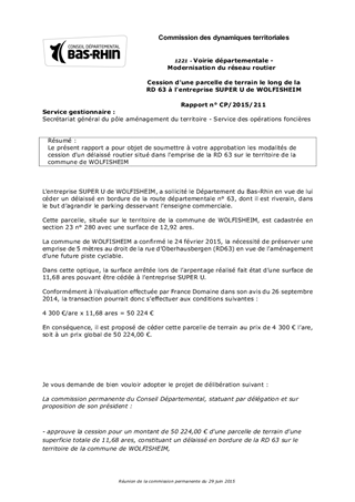 Cession d'une parcelle de terrain le long de la RD 63 à l'entreprise SUPER U de WOLFISHEIM