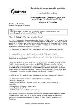 Le présent rapport concerne une demande de garantie présentée par le Pôle d’Archéologie Interdépartemental Rhénan (PAIR)