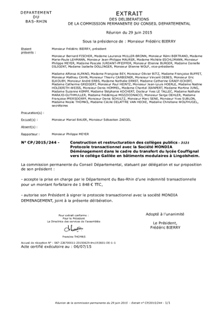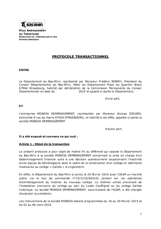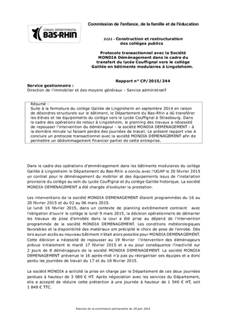 Suite à la fermeture du collège Galilée de Lingolsheim en septembre 2014 en raison de désordres structurels sur le bâtiment, le Département du Bas-Rhin a dû transférer les élèves et les équipements du collège vers le Lycée Couffignal à Strasbourg. Dans le cadre des opérations de retour à Lingolsheim, le planning des travaux a nécessité de repousser l'intervention du déménageur - la société MONDIA DEMENAGEMENT - à la dernière minute lui faisant perdre des journées de travail. Le présent rapport vise à conclure un protocole transactionnel avec la société MONDIA DEMENAGEMENT afin de permettre un dédommagement financier partiel de cette entreprise.
