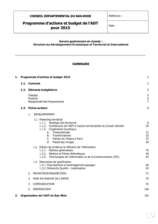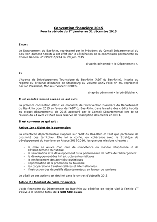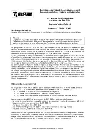 Le présent rapport a pour objet de soumettre à la Commission Permanente du Conseil Départemental le Contrat d'Objectifs de l'Agence de Développement Touristique du Bas-Rhin qui détaille le plan d'actions pour l'exercice 2015 et les moyens alloués.