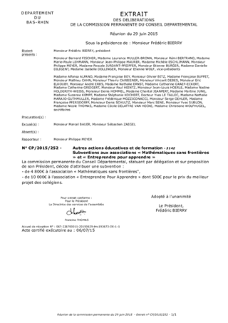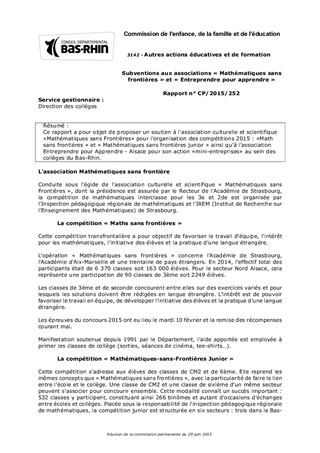 Ce rapport a pour objet de proposer un soutien à l'association culturelle et scientifique «Mathématiques sans Frontières» pour l'organisation des compétitions 2015 : «Math sans frontières » et « Mathématiques sans frontières junior » ainsi qu’à l’association Entreprendre pour Apprendre - Alsace pour son action «mini-entreprises» au sein des collèges du Bas-Rhin.