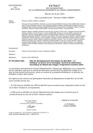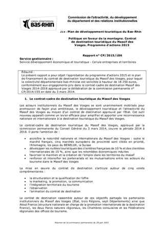 Le présent rapport a pour objet l'approbation du programme d'actions 2015 et le plan de financement du contrat de destination touristique du Massif des Vosges, pour lequel la collectivité départementale bas-rhinoise est sollicitée à hauteur de 18 250 euros, conformément aux engagements pris dans le contrat-cadre de destination Massif des Vosges 2014-2018 approuvé par la délibération de la commission permanente n° CP/2014/155 en date du 3 mars 2014.