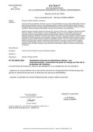 En 2005, le Département du Bas-Rhin et le Séminaire de Jeunes de WALBOURG ont signé une convention permettant la prise en charge de jeunes en difficulté éducative confiés au Département dans le cadre de l’Aide Sociale à l’Enfance ou bénéficiant d’une mesure éducative à domicile. Depuis, une vingtaine de jeunes sont admis chaque année dans l’établissement. Compte tenu de la qualité du partenariat et de l’adéquation de la prise en charge aux besoins des jeunes et des familles, pour une prestation moins coûteuse qu’un placement, il est proposé de mettre à jour la convention.