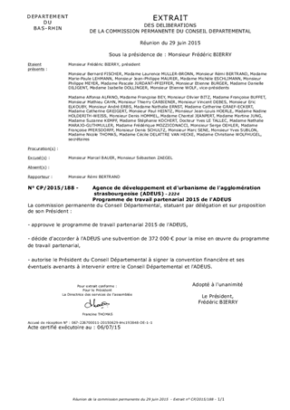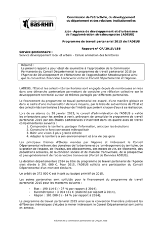 Le présent rapport a pour objet de soumettre à l'approbation de la Commission Permanente du Conseil Départemental le programme de travail partenarial 2015 de l'Agence de Développement et d'Urbanisme de l'agglomération Strasbourgeoise ainsi que la convention financière à intervenir entre le Conseil Départemental et l'Agence.