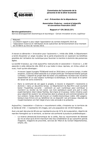 Le présent rapport a pour objet l'approbation du contrat d'objectifs 2015 de l'association Clubviva et l'attribution d'une subvention de fonctionnement d'un montant de 25 000 € au titre de l'année 2015.