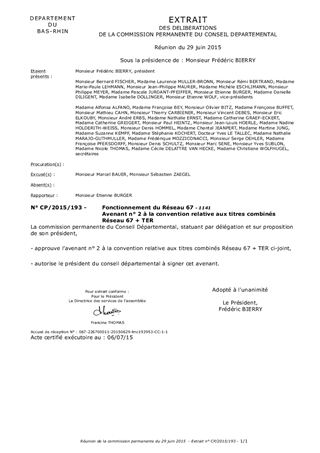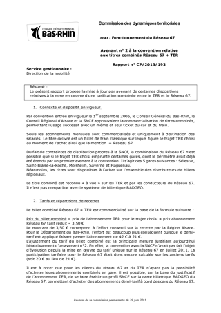 Le présent rapport propose la mise à jour par avenant de certaines dispositions relatives à la mise en oeuvre d'une tarification combinée entre le TER et le Réseau 67.