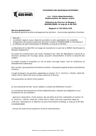 Le présent rapport a pour objet de soumettre à votre approbation les modalités d'acquisition de plusieurs parcelles de terrain situées à WASSELONNE et nécessaires à la réfection du pont franchissant la MOSSIG, le long de la RD 824.