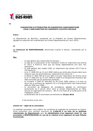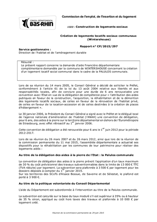 Le présent rapport concerne la demande d’aide financière départementale complémentaire demandée par la commune de WINTERSHOUSE concernant la création d’un logement locatif social communal dans le cadre de la PALULOS communale.
