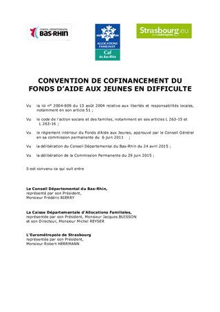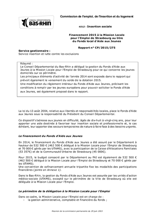 Le Conseil Départemental du Bas-Rhin a délégué la gestion du Fonds d’Aide aux Jeunes à la Mission Locale pour l’Emploi de Strasbourg pour ce qui concerne les jeunes domiciliés sur ce périmètre. Les principaux éléments d’activité de l’année 2014 sont exposés dans le rapport qui prévoit également le versement du solde de la dotation 2015. Une modification du règlement intérieur du Fonds d’Aide aux Jeunes, précisant les conditions à remplir par les jeunes européens pour pouvoir solliciter le Fonds d’Aide aux Jeunes, est également proposé dans le rapport.