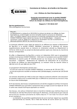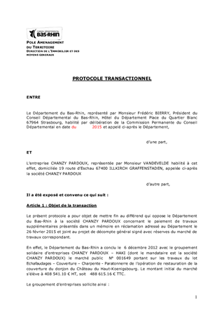 Le Département a restauré en 2013/2014 la toiture du donjon du château du Haut-Koenigsbourg, endommagée lors de la tempête Joachim survenue en décembre 2011. Le présent rapport vise à conclure un protocole transactionnel avec l’entreprise CHANZY PARDOUX ayant réalisé les travaux du lot Echafaudages – charpente-couverture, suite au dépôt d’un mémoire en réclamation lors de la constitution du décompte général définitif du marché de travaux.