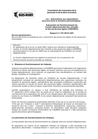 En application de la loi du 13 août 2004, relative aux libertés et responsabilités locales, le Comité départemental des retraités et des personnes âgées (CODERPA) est placé depuis le 1er janvier 2005 sous la responsabilité du Président du Conseil Départemental. Le Conseil Départemental est appelé à se prononcer sur la subvention de fonctionnement annuelle accordée au Coderpa.