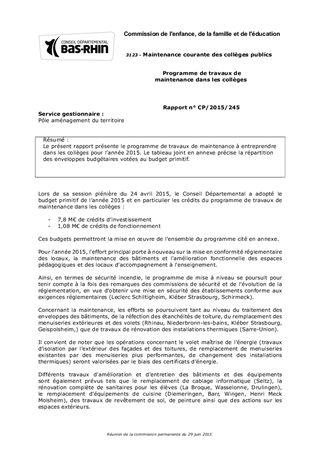 Le présent rapport présente le programme de travaux de maintenance à entreprendre dans les collèges pour l’année 2015. Le tableau joint en annexe précise la répartition des enveloppes budgétaires votées au budget primitif.