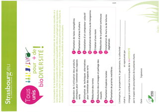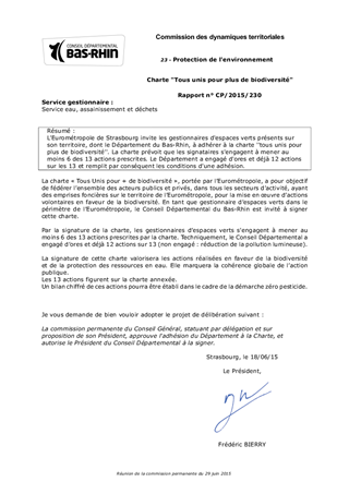 L’Eurométropole de Strasbourg invite les gestionnaires d'espaces verts présents sur son territoire, dont le Département du Bas-Rhin, à adhérer à la charte ''tous unis pour plus de biodiversité''. La charte prévoit que les signataires s'engagent à mener au moins 6 des 13 actions prescrites. Le Département a engagé d'ores et déjà 12 actions sur les 13 et remplit par conséquent les conditions d'une adhésion.