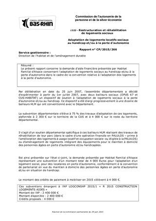 Le présent rapport concerne la demande d'aide financière présentée par Habitat Familial d'Alsace concernant l'adaptation de logements sociaux au handicap et/ou à la perte d'autonomie dans le cadre de la convention relative à l'adaptation des logements à la perte d'autonomie.