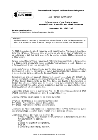 Le présent rapport concerne la demande de subvention de la Ville de Haguenau dans le cadre de la réalisation d'une étude de cadrage pour le quartier des pins à Haguenau.