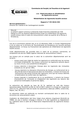 Le présent rapport concerne la demande d'aide financière présentée par CUS Habitat au titre du dispositif départemental d'aide à la réhabilitation de logements locatifs sociaux dans le cadre du renouvellement urbain du quartier de la Meinau à Strasbourg.