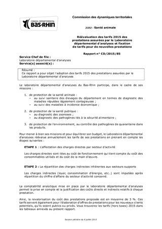 Ce rapport a pour objet l'adoption des tarifs 2015 des prestations assurées par le Laboratoire départemental d'analyses