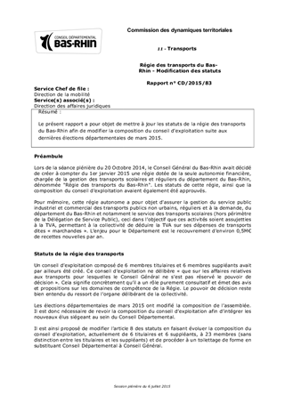 Le présent rapport a pour objet de mettre à jour les statuts de la régie des transports du Bas-Rhin afin de modifier la composition du conseil d'exploitation suite aux dernières élections départementales de mars 2015.