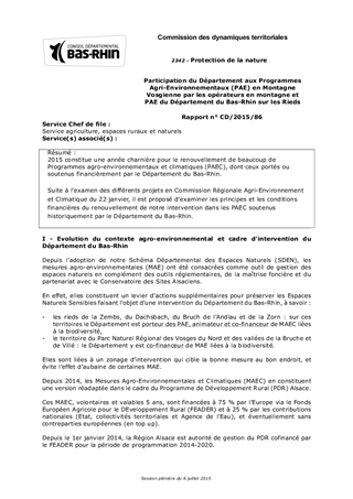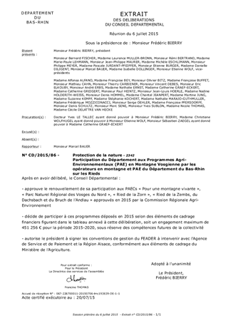 2015 constitue une année charnière pour le renouvellement de beaucoup de Programmes agro-environnementaux et climatiques (PAEC), dont ceux portés ou soutenus financièrement par le Département du Bas-Rhin. Suite à l’examen des différents projets en Commission Régionale Agri-Environnement et Climatique du 22 janvier, il est proposé d’examiner les principes et les conditions financières du renouvellement de notre intervention dans les PAEC soutenus historiquement par le Département du Bas-Rhin.