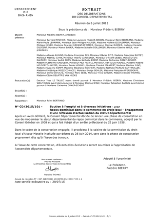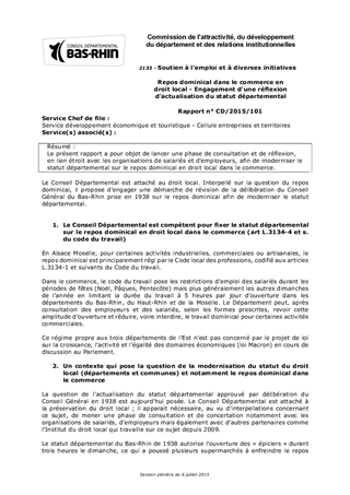 Le présent rapport a pour objet de lancer une phase de consultation et de réflexion, en lien étroit avec les organisations de salariés et d'employeurs, afin de moderniser le statut départemental sur le repos dominical en droit local dans le commerce.