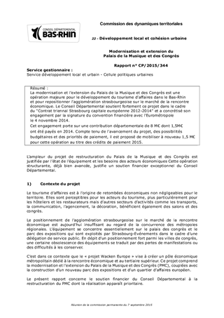 La modernisation et l'extension du Palais de la Musique et des Congrès est une opération majeure pour le développement du tourisme d'affaires dans le Bas-Rhin et pour repositionner l'agglomération strasbourgeoise sur le marché de la rencontre économique. Le Conseil Départemental soutient fortement ce projet dans le cadre du "Contrat triennal Strasbourg capitale européenne 2012-2014" et a concrétisé son engagement par la signature du convention financière avec l'Eurométropole le 4 novembre 2014. Cet engagement porte sur une contribution départementale de 8 M€ dont 1,5M€ ont été payés en 2014. Compte tenu de l'avancement du projet, des possibilités budgétaires et des priorités de paiement, il est proposé de mobiliser à nouveau 1,5 M€ pour cette opération au titre des crédits de paiement 2015.