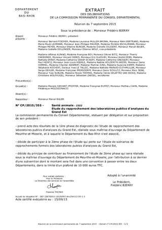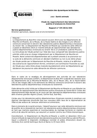 Le Département du Bas-Rhin s’est associé courant 2014 avec les Départements de Meurthe-et-Moselle, de la Meuse, de la Haute-Saône et des Vosges à une réflexion commune concernant le devenir des laboratoires publics départementaux d'analyses du Grand- Est. Le Département de Meurthe-et-Moselle qui coordonne cette réflexion a passé en décembre 2014 un marché d'étude de rapprochement des laboratoires publics départementaux d'analyses du Grand- Est à un prestataire (cabinet Phylum). La 1ère phase de l'étude portant sur l'état des lieux comparatif des laboratoires publics précités a été prise en charge intégralement par le Département de Meurthe-et-Moselle. Notre collectivité départementale est à présent amenée à se prononcer sur la suite de la démarche commune en décidant d'adhérer ou non à une 2ème phase de l'étude portée par le Département de Meurthe-et-Moselle, relative à la définition des scénarios de rapprochement formel, entraînant une contribution financière au coût de l'étude pour cette 2ème phase modulée équitablement entre les Départements qui décideront de poursuivre cette démarche de réflexion commune.