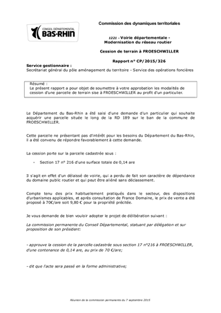 Le présent rapport a pour objet de soumettre à votre approbation les modalités de cession d'une parcelle de terrain sise à FROESCHWILLER au profit d'un particulier.