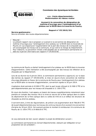 Le présent rapport vise à proposer un avenant à la convention de désignation de maîtrise d’ouvrage pour l’aménagement d’un plateau sur la RD39 dans la traversée de Fouchy en vue d’approuver l’augmentation de la part des travaux de la chaussée qui ont accompagné les travaux de la commune, et qui sont à la charge du Département. Pour mémoire, la convention initiale a été adoptée par la commission permanente en date du 6 janvier 2014 dans son rapport n° CP/2014/50.
