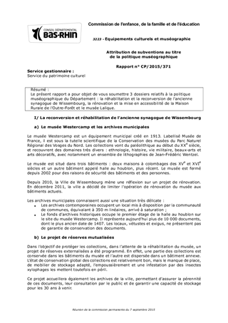Le présent rapport a pour objet de vous soumettre 3 dossiers relatifs à la politique muséographique du Département : la réhabilitation et la reconversion de l’ancienne synagogue de Wissembourg, la rénovation et la mise en accessibilité de la Maison Rurale de l'Outre-Forêt et le musée Lalique.