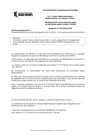 Le présent rapport à pour objet de soumettre à votre approbation le déclassement d'une parcelle issue du domaine public routier située à RUSS, préalablement à sa vente.