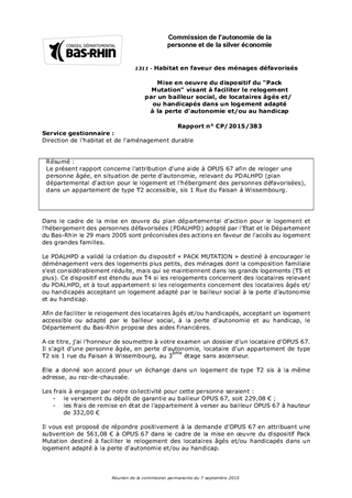 Le présent rapport concerne l'attribution d'une aide à OPUS 67 afin de reloger une personne âgée, en situation de perte d'autonomie, relevant du PDALHPD (plan départemental d'action pour le logement et l'hébergment des personnes défavorisées), dans un appartement de type T2 accessible, sis 1 Rue du Faisan à Wissembourg.