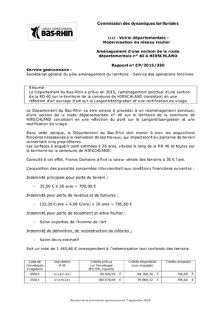 Le Département du Bas-Rhin a prévu en 2015, l'aménagement ponctuel d'une section de la RD 40 sur le territoire de la commune de HIRSCHLAND consistant en une réfection d'un ouvrage d'art sur le Langenbitzengraben et une rectification de virage.