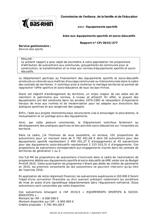 Le présent rapport a pour objet de soumettre à votre approbation les propositions d’attribution de subventions aux communes, groupements de communes pour la construction, la transformation et la mise aux normes d’équipements sportifs et socio-éducatifs.